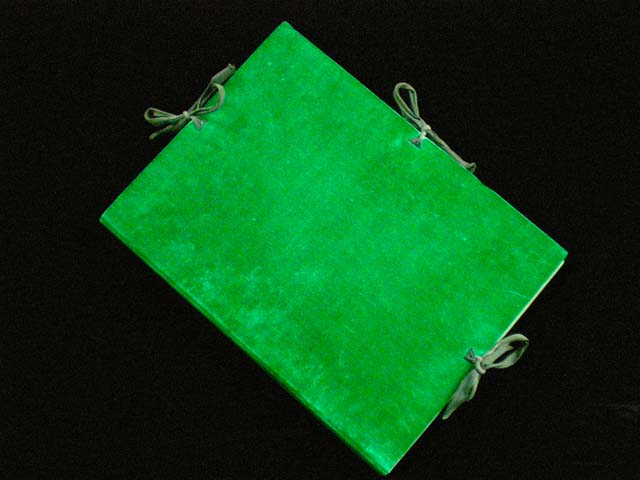 | Die grüne Bilderbox in Baumwollsamt ist eine echte Kartonage-Arbeit von der zwei Exemplare hergestellt wurden. Da Runa die Bilder immer sehr schnell verkaufen konnte, mussten sie fotografiert werden, um auch in Zukunft die Geschichte dieser Kunst fortlaufend zu dokumentieren. So dämmerte die Idee für die grüne Bilderbox. Mit der grünen Bilderbox unter dem Arm lief Runa im laufe der Zeit quer durch die Schweiz und manche Schuhsolen durch. Auf diese Weise kamen vielfältige Kontackte zustande, es wurde verkauft und bald gingen auch Unzählige Siebdrucke Litografien und eingerahmte Reproduktionen unter die Menschen. Über viele Jahre hindurch wurde so die bescheidene Existenz gesichert. |