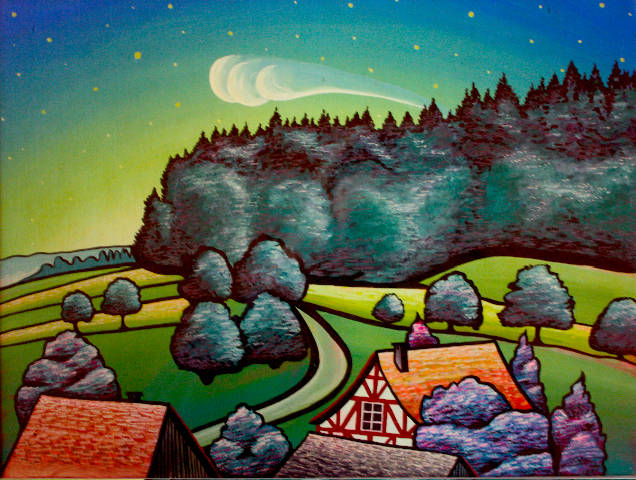 | Acrylmalerei von Runa. In einem grossen Haus in Raat im Kanton Zürich wohnten die Musikerfreunde von Sonja und Runa. Von da aus hatte man die oben gemalte Aussicht. Die Experimental-Pop-Rock Band waren damals die sehr bekannten ISLAND. Hier lebte auch Güge Ex-Schagzeuger von The Q 66 ein alter Freund, der damals Schlagzeuer bei ISLAND war. 1975 auf der Durchreise zwischen Basel und St. Gallen wurde in Raat immer ein Zwischenhalt eingelegt. Es gab meistens ein grosses Gelage und es wurde bis in den Morgen hinein gefestet und viel gelacht. Von ISLAND existieren Tonträger. |