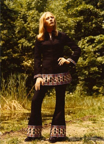 Minikleid und Schlaghose verziert mit Agyptstickerei 1969,