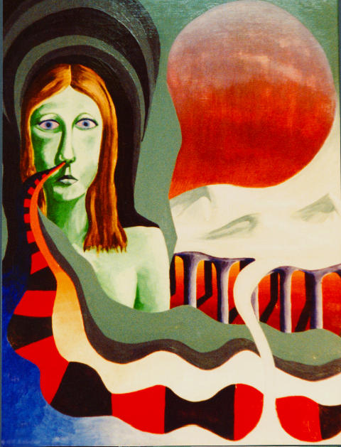 | Ölmalerei von Runa. Verlogene Moral, falsche Wissenschaft und technische Entwicklung, Machtstreben und Gier, (machet uns die Erde und den Menschen untertan). Dieser Zustand steigerte sich über viele Jahrhunderte zum heutigen materiellen Denken und könnte zur totalen Selbstzerstörung der Menschen auf diesem Planeten führen. Runa wurde bei solchen Worten ausgelacht und verhöhnt, als Wirtschafts-Schädling und Verrückter hingestellt. |